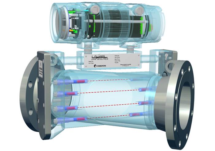 Cameron's CALDON® 380Ci ultrasonic gas flow meter has Cameron's unique eight-path, dual-plane, cross-path design. Cameron has done extensive testing to prove this meter design is immune from the effects of swirl and velocity profile asymmetry. The 380Ci requires a very small installation footprint and does not require a flow conditioner. The 380Ci gas flow meter is available for pipe sizes 6" and larger and is typically used in custody transfer and other fiscal applications.