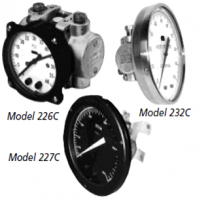 Model 226C (w/224C DPU) A 3-inch (76 mm) indicator is a lightweight and compact instrument for use where panel space is at a premium. Model 227C (w/224C DPU) A 6-inch (152 mm) indicator that is ideally suited for tank level, flow, and pressure drop across filters. This model is also available in stainless steel (M227CS). Model 232C (w/224C DPU) An economical 6-inch (152 mm) DP indicator that is designed for use in applications where high accuracies are not required. Suitable for tank level, flowrate, and DP across filters applications. It features a 500 psi (34.5 bar) SWP Maximum and a 0-50" w.c. to 0-100 PSID (0-124 mbar to 6.9 bar) DP Range. The case and bezel are 304 SST. The housings are forged brass (steel and SST optional) with 1/4" x 1/4" NPT connections. The bellows are BeCu or 316 SST, with an Ethylene Glycol and Water Fill. The indicating accuracy is ±2.00 % of full scale. The unit can be pipe, wall, or panel mounted.